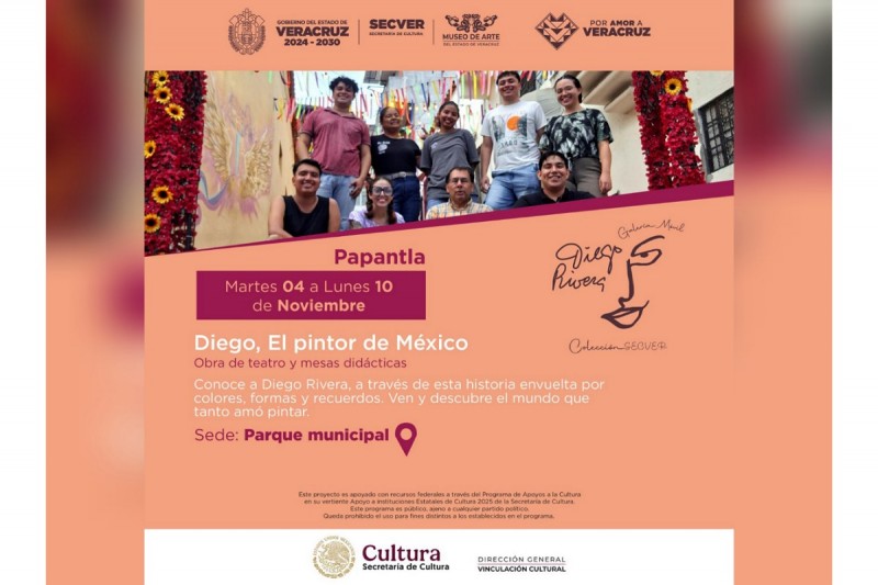 La Secretaría de Cultura de Veracruz (SECVER), en colaboración con el Ayuntamiento de Papantla, invita a conocer la Galería Móvil 2025: Diego Rivera, la muestra se expone en el parque municipal a partir de hoy y hasta el 10 de noviembre.