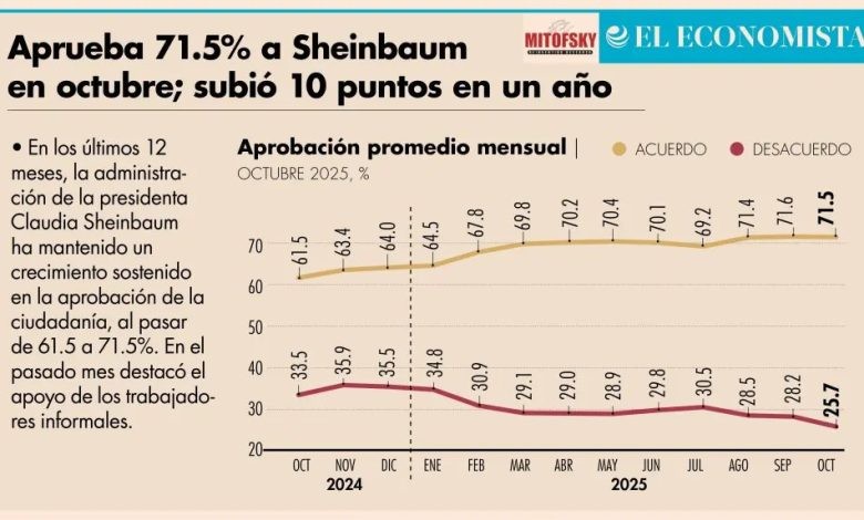 En octubre pasado, siete (71.5%) de cada 10 mexicanos manifestaron estar de acuerdo con la forma en que está trabajando la presidenta Claudia Sheinbaum; a un año de haber asumido el cargo, la popularidad de la mandataria mexicana subió 10 puntos.