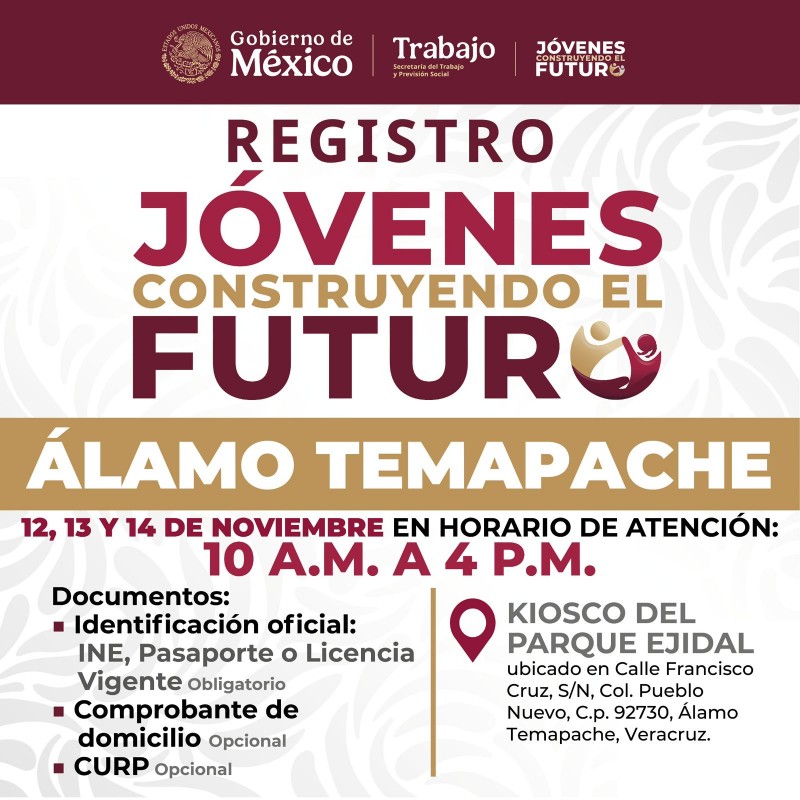 El Gobierno Federal y el Gobierno del Estado, a través de la Secretaría del Trabajo, invitan a las y los jóvenes veracruzanos a participar en el registro del programa “Jóvenes Construyendo el Futuro”, que se llevará a cabo del 12 al 14 de noviembre, en horario de 10:00 a 16:00 horas.