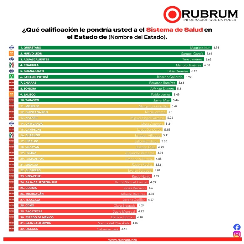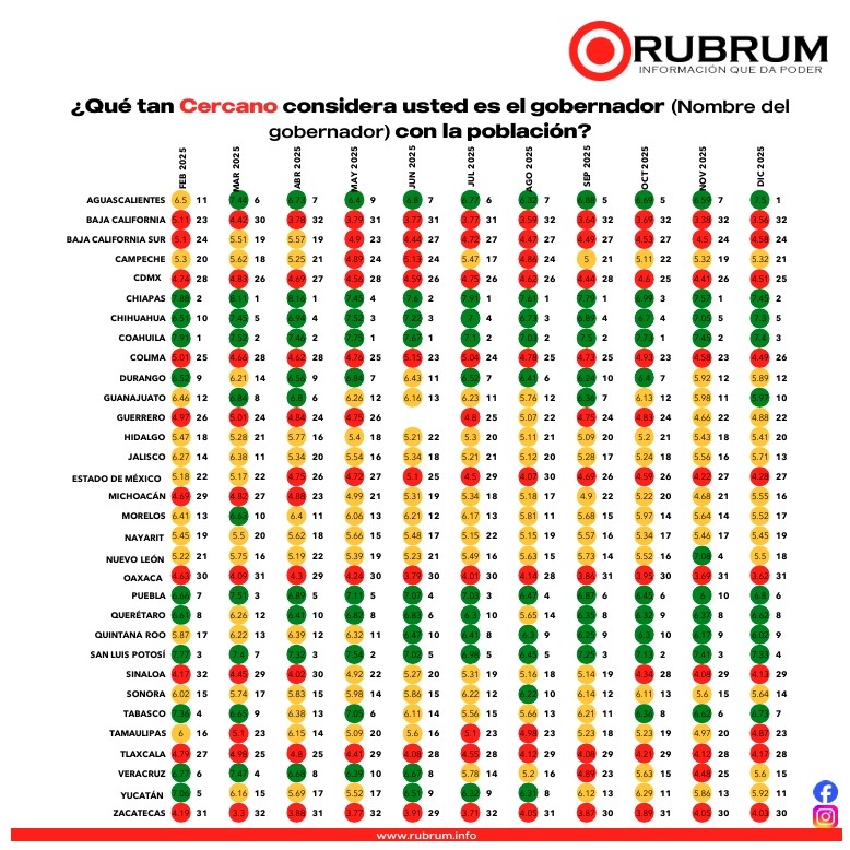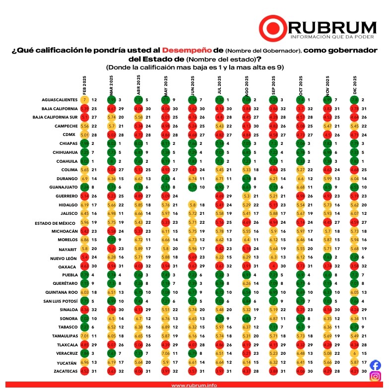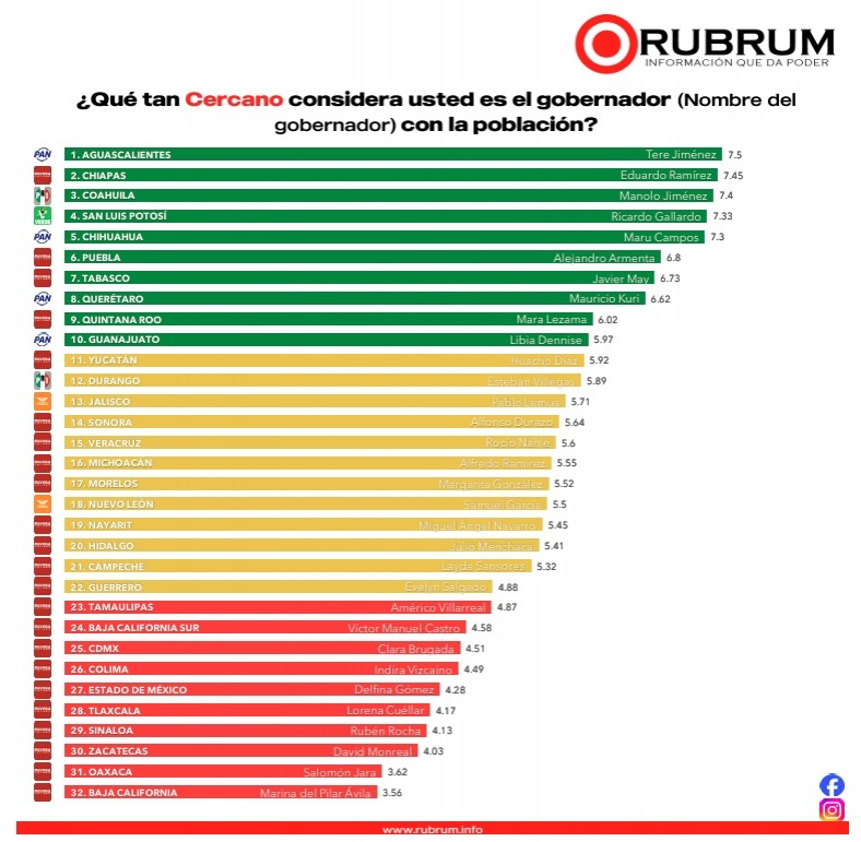De acuerdo con la más reciente medición de la encuestadora Rubrum, correspondiente a la Evaluación de Gobernadores, la mandataria veracruzana Rocío Nahle García se consolida como la gobernadora número 15 mejor evaluada a nivel nacional, reafirmando el respaldo ciudadano hacia su administración a poco más de un año de iniciar su gestión.