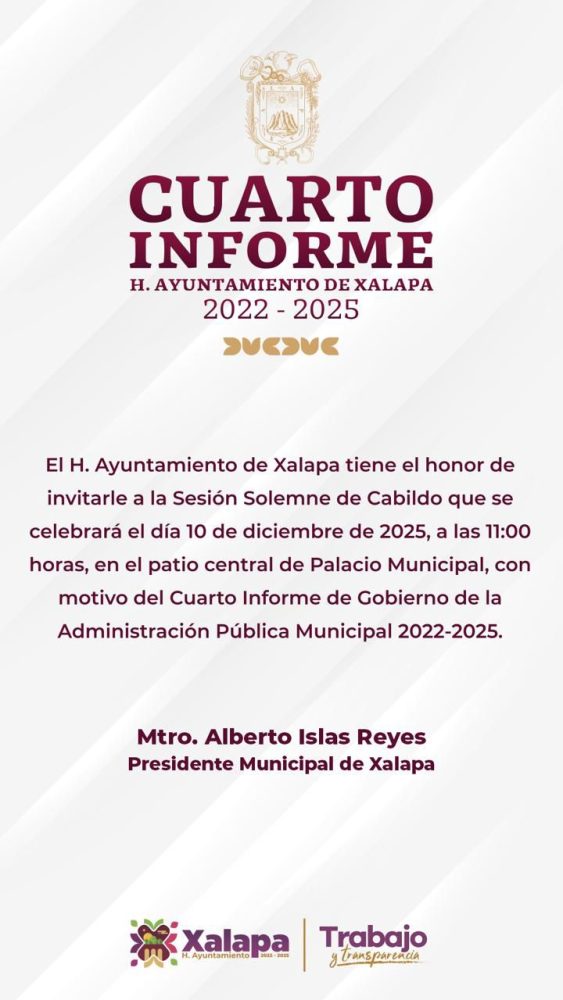 En cumplimiento a los ordenamientos legales y los principios de transparencia y rendición de cuentas, el próximo 10 de diciembre, a las 11:00 horas, el alcalde Alberto Islas Reyes rendirá el Cuarto Informe del Estado que Guarda la Administración Pública Municipal 2022-2025.