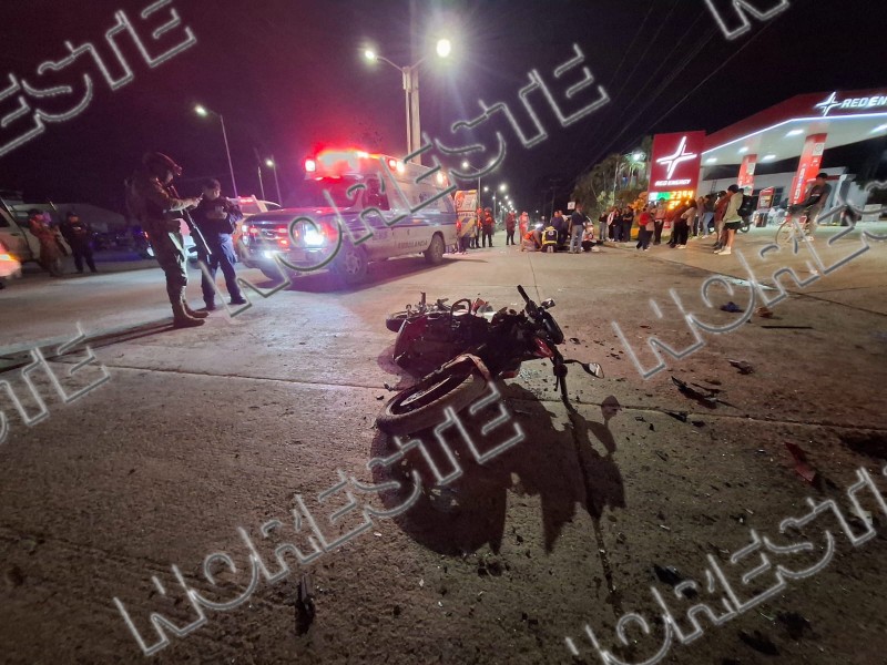 Según información recabada, dos jóvenes que viajaban en una motocicleta color rojo se desplazaban con dirección al norte cuando, al llegar frente a una gasolinera, se encontraron de frente con un vehículo compacto que intentaba incorporarse a otra vialidad.