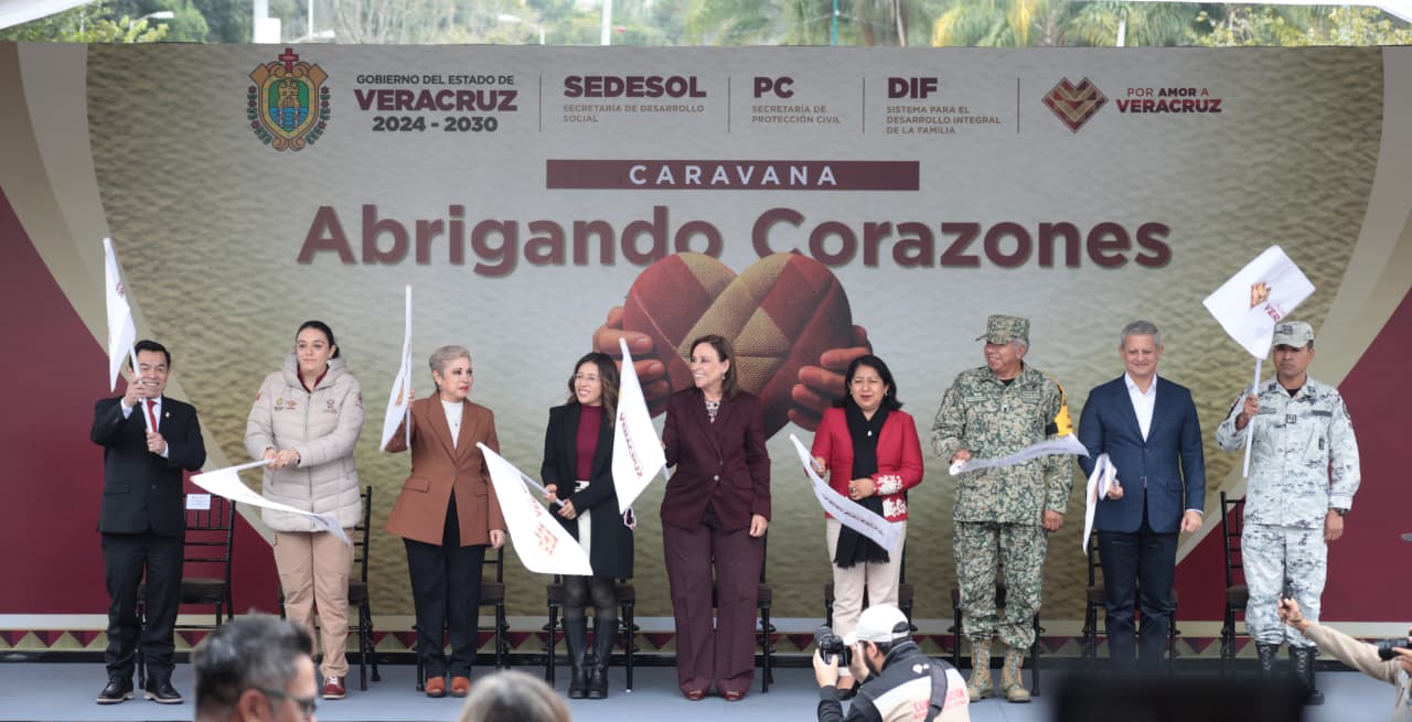 Con el compromiso de acompañar a las familias que enfrentan las temperaturas más bajas del estado, la gobernadora Rocío Nahle García dio el banderazo de salida a la Caravana Abrigando Corazones, desde la explanada del DIF Estatal, donde inició formalmente la entrega de apoyos invernales y servicios esenciales a las regiones con mayor vulnerabilidad ante el frío.