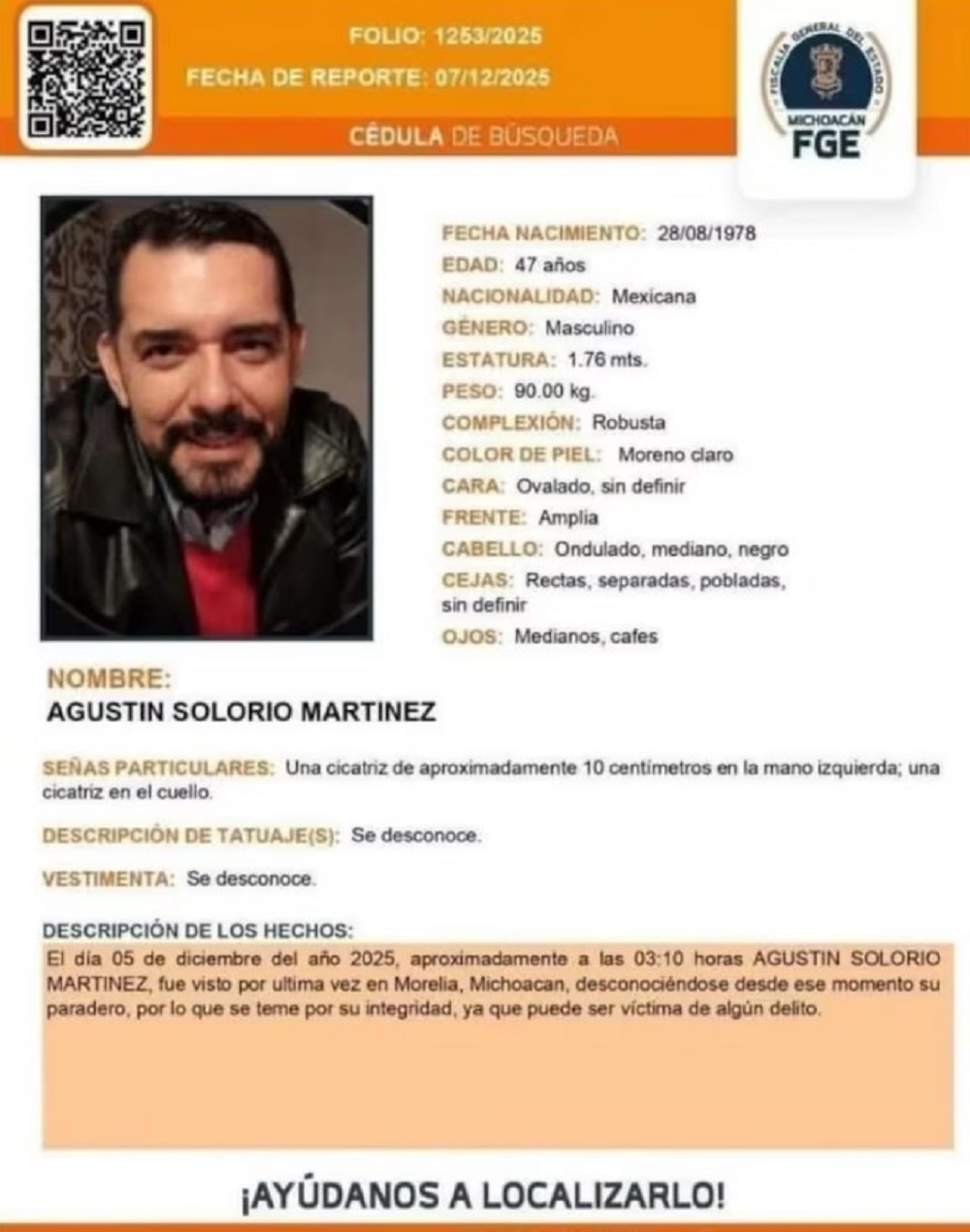 Solorio Martínez había sido visto por última vez en la madrugada del pasado 5 de diciembre en Morelia. La Fiscalía General del Estado (FGE) de Michoacán había emitido una ficha de búsqueda, advirtiendo que se temía por su integridad.