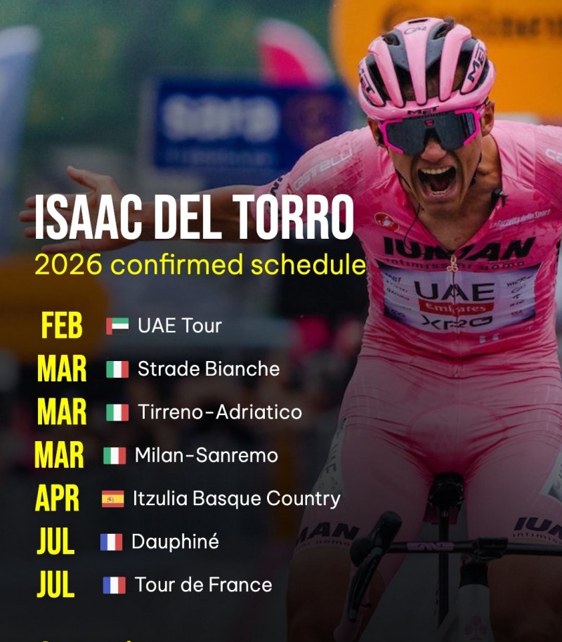 Del Toro, una de las principales figuras del equipo junto al esloveno Tadej Pogacar, correrá antes el Tour de Emiratos Árabes; en Italia la Strade Bianche, la Milán-San Remo y la Tirreno-Adriático; la Vuelta al País Vasco y el Tour Auvernia Rodano Alpes (antiguamente Dauphine).