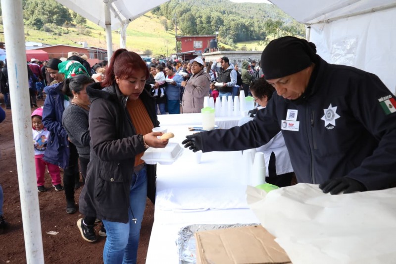 Asimismo, la Secretaría de Seguridad Pública participó activamente en la localidad de Acocota, municipio de Acajete, mediante la instalación de una cocina móvil para servir porciones de comida caliente, la entrega de alimentos preparados y libros infantiles, fortaleciendo el bienestar y desarrollo integral de niñas y niños.
