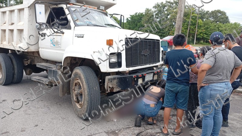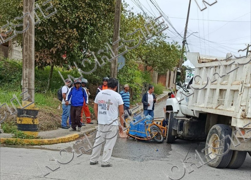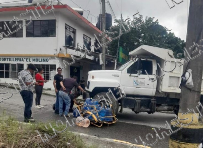 Un comerciante dedicado a la venta de agua en garrafón terminó con diversas heridas luego de ser atropellado por un camión de volteo mientras se desplazaba empujando un triciclo, en la colonia Los Pinos.