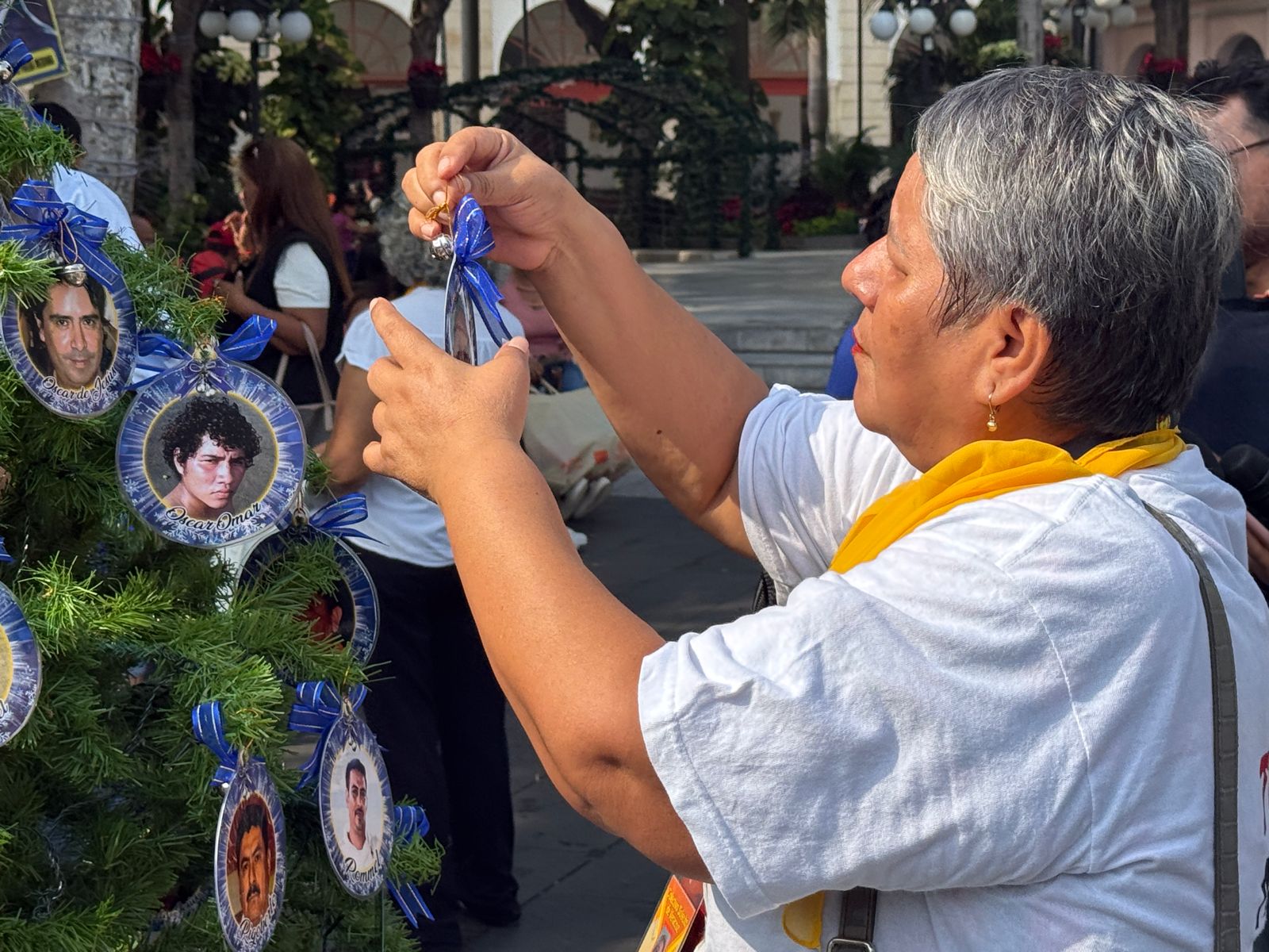 El pino navideño fue adornado con decenas de esferas que contienen los rostros de hombres y mujeres ausentes, una representación simbólica del vacío que persiste en cientos de familias veracruzanas.