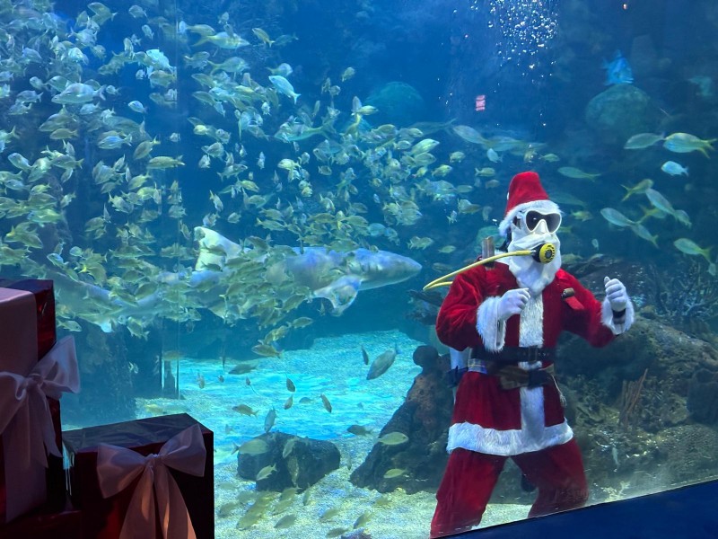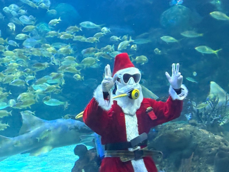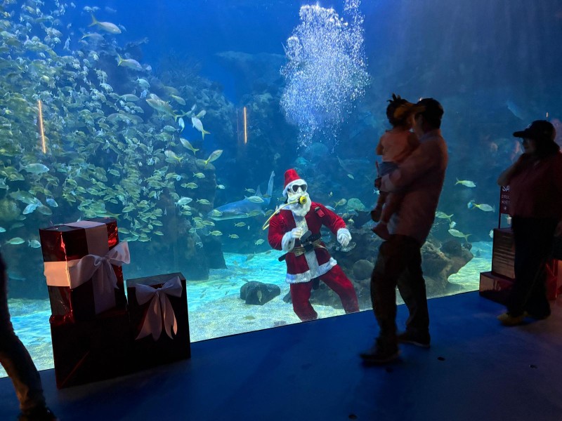 Visitantes del Aquarium de Veracruz vivieron un momento poco habitual durante el fin de semana, luego de que Santa Claus realizó una aparición especial al sumergirse en la gran pecera del recinto, equipado con traje de buceo y portando su característico atuendo rojo.