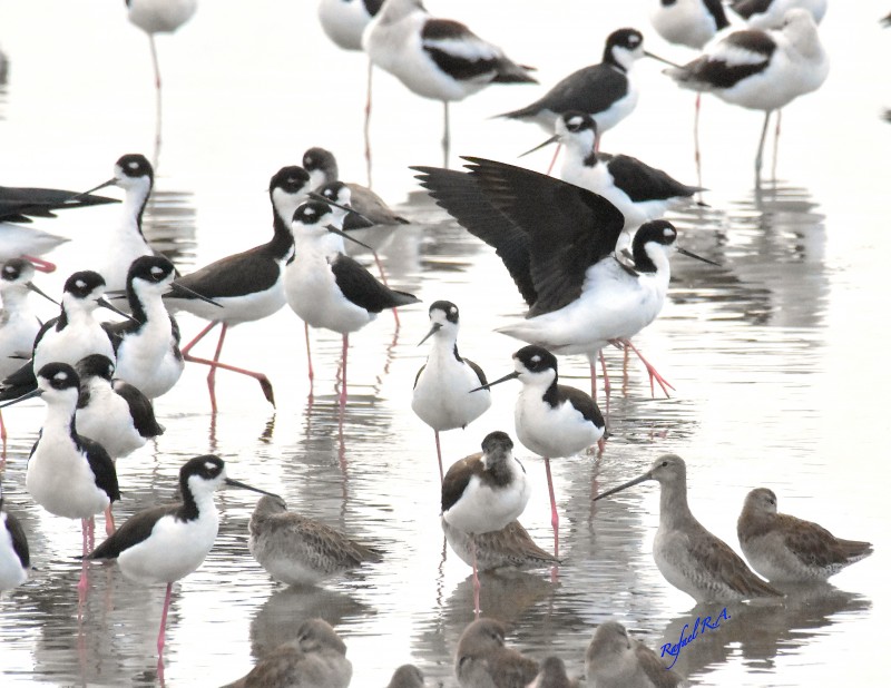 Plumaje Blanco y negro, patas muy largas y rojas.