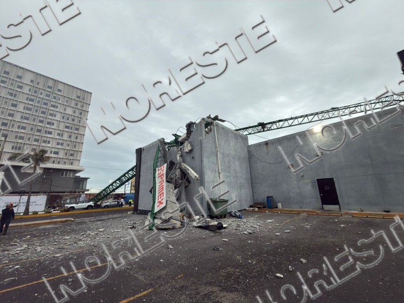 Una grúa de construcción de gran altura cayó sobre un negocio en Boca del Río debido a las fuertes rachas de viento generadas por el frente frío número 25.