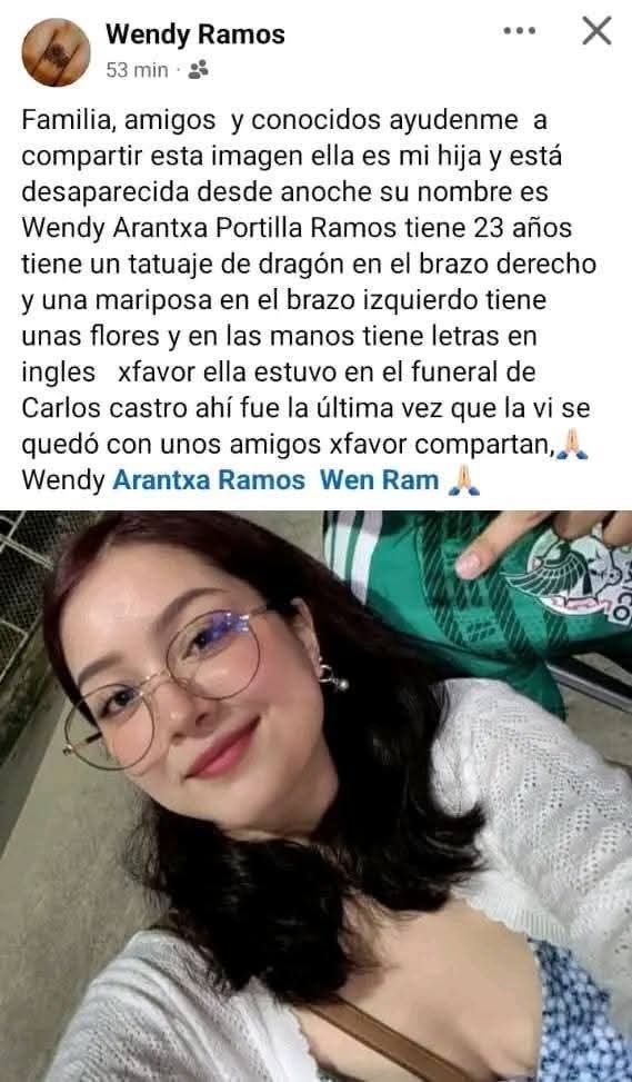El primer caso corresponde a Wendy Arantxa Portilla Ramos, de 23 años de edad, quien fue vista por última vez durante el funeral del reportero Carlos Castro, a donde acudió en compañía de unos amigos, sin que hasta el momento se tenga información clara sobre su paradero.