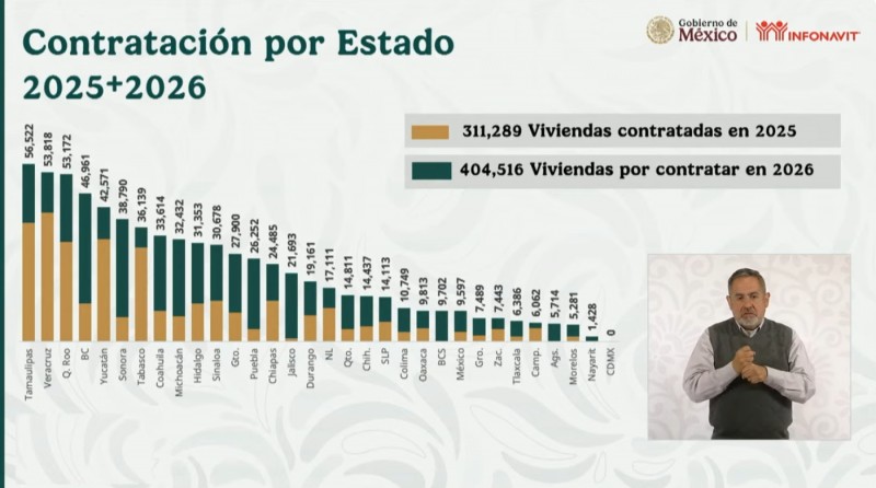 Según el balance presentado, 2025 cerró con 311 mil viviendas contratadas, liderando la lista estados como Veracruz, Tamaulipas, Quintana Roo y Yucatán.