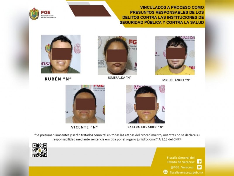 La Fiscalía General del Estado, a través de la Fiscalía Regional Coatzacoalcos, obtuvo la vinculación a proceso de Vicente “N”, Miguel Ángel “N”, Rubén “N”, Carlos Eduardo “N” y Esmeralda “N”, señalados como presuntos responsables del delito contra las instituciones de seguridad pública. De igual forma, Esmeralda “N”, Carlos Eduardo “N” y Rubén “N” fueron vinculados a proceso por su probable responsabilidad en el delito contra la salud.