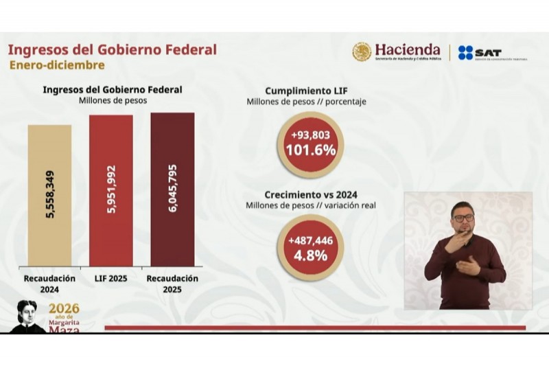 El Servicio de Administración Tributaria (SAT) cerró el ejercicio fiscal 2025 con cifras positivas que superaron las expectativas presupuestarias. Antonio Martínez Dagnino, titular del organismo, informó que los ingresos de la Federación registraron un crecimiento del 4.8% en términos reales en comparación con el año anterior, consolidando la eficiencia recaudatoria del gobierno federal.