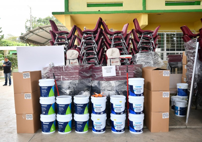 En total, 15 secundarias de Poza Rica recibieron 2 mil 257 kits escolares, mil 421 sillas, 710 mesas, 183 cubetas de impermeabilizante, 131 cubetas de pintura de 19 litros, 113 pizarrones, 47 pantallas de 55 pulgadas para 11 telesecundarias, así como 30 brochas y 30 rodillos, destinados al mejoramiento de las condiciones de los planteles.