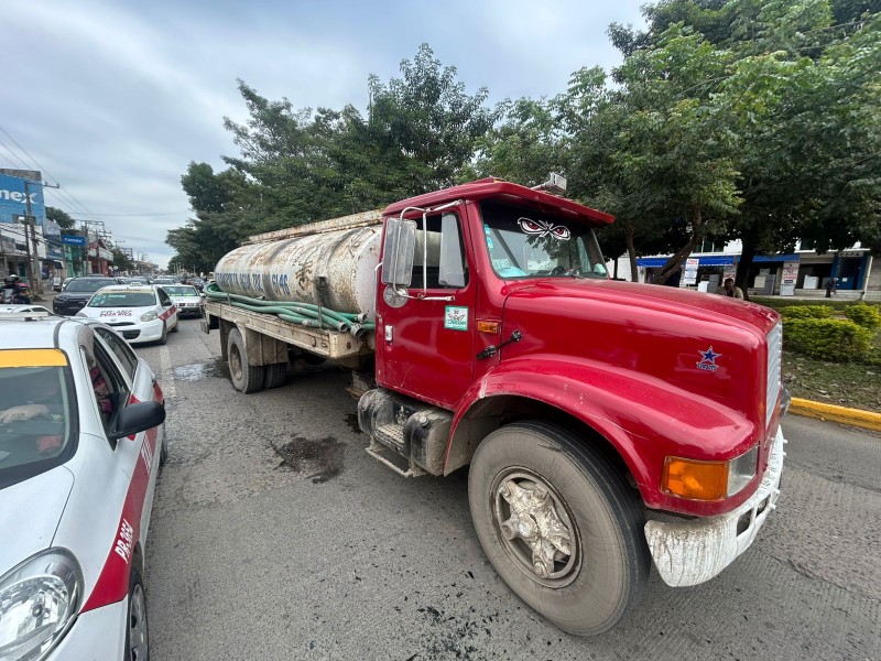 Según testigos, el conductor de la pipa no respetó la distancia de seguridad y terminó por impactar la camioneta, causando daños materiales considerables en el medallón trasero de la unidad. Afortunadamente, el conductor de la camioneta resultó ileso, aunque sí se encontraba asustado por el fuerte golpe.