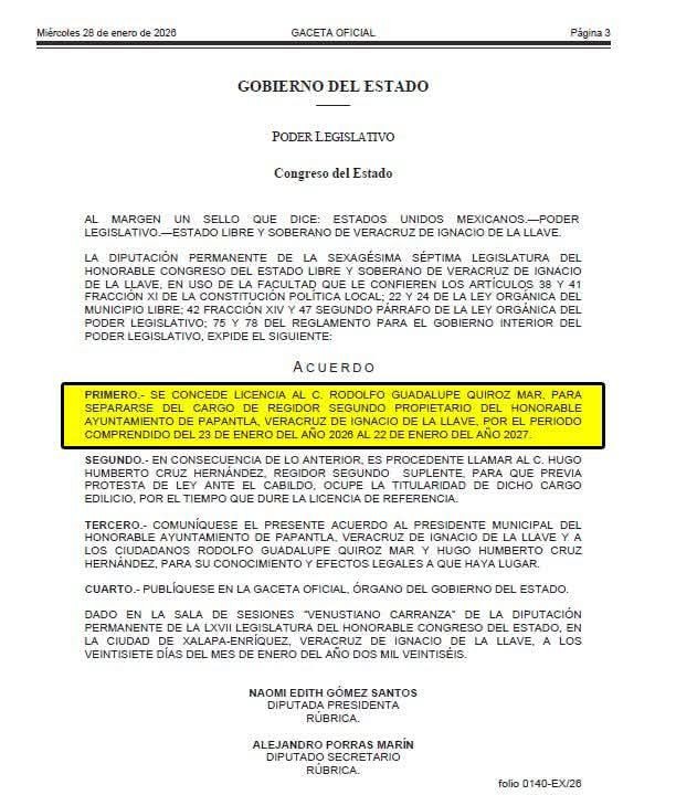 El Congreso del Estado de Veracruz autorizó la solicitud de licencia del regidor segundo, Dr. Rodolfo Guadalupe Quiroz Mar, motivo por el cual su suplente, Hugo Humberto Cruz Hernández, será llamado a ocupar el cargo y rendirá protesta durante la próxima sesión de Cabildo.