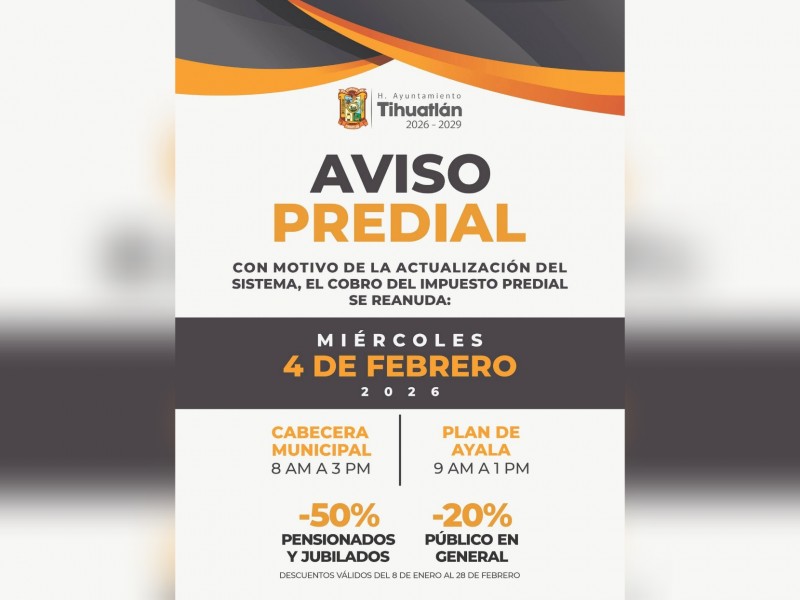 El H. Ayuntamiento de Tihuatlán informa a la ciudadanía que el pago del Impuesto Predial se reanudará el próximo miércoles 4 de febrero, una vez concluida la actualización del sistema de cobro, acción que permitirá brindar un mejor servicio a las y los contribuyentes.
