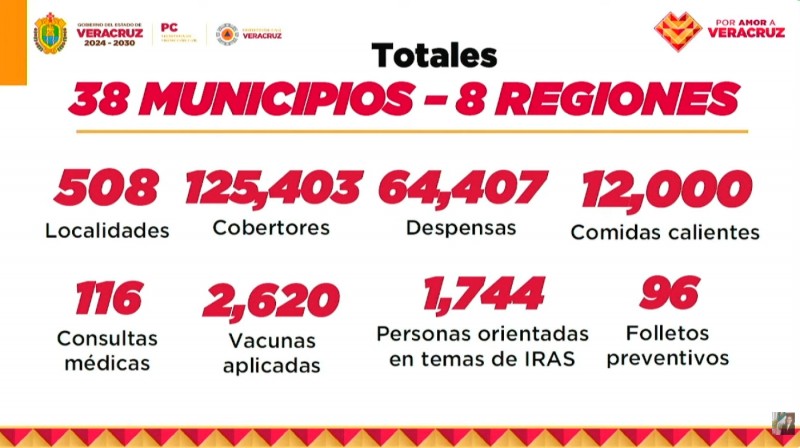 La funcionaria estatal detalló que la estrategia ha beneficiado a más de 50 comunidades mediante un esfuerzo coordinado entre la SEDENA, Guardia Nacional, SSP, SEDESOL, SESVER, el DIF Estatal y los Ayuntamientos. Osorno Maldonado aclaró que, aunque el ambiente ha sido gélido, no se han alcanzado mínimos históricos o temperaturas extremas que pongan en riesgo crítico a la población, permitiendo que las acciones preventivas operen con eficacia.