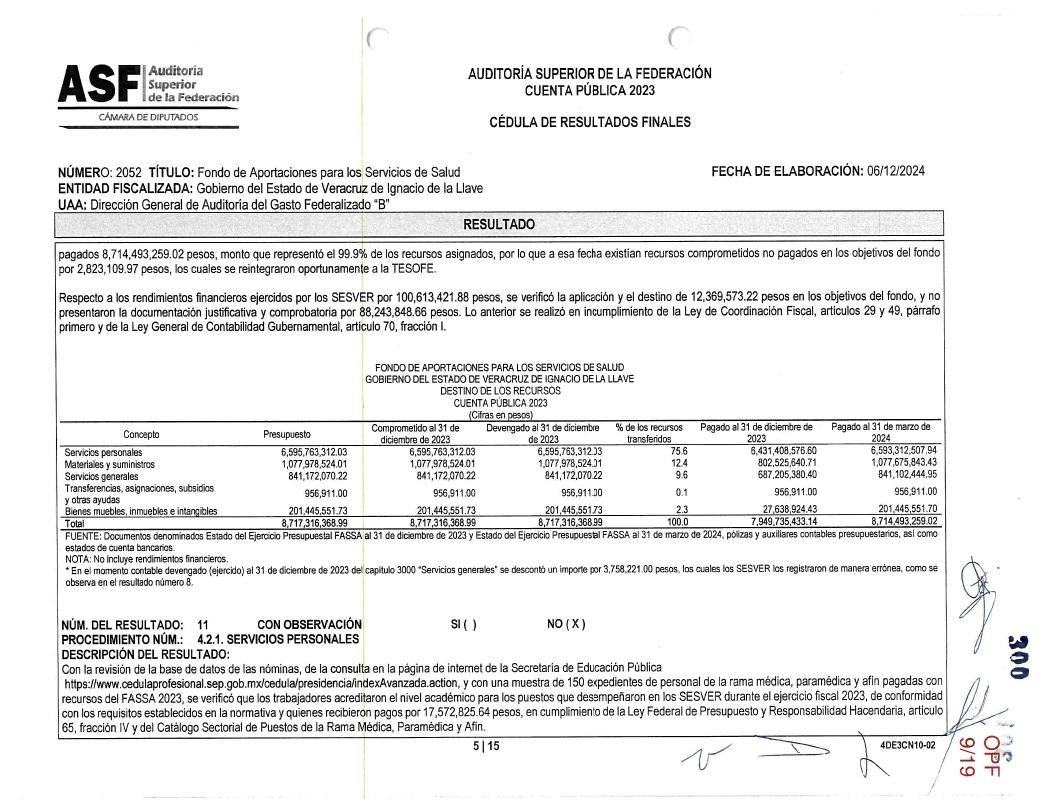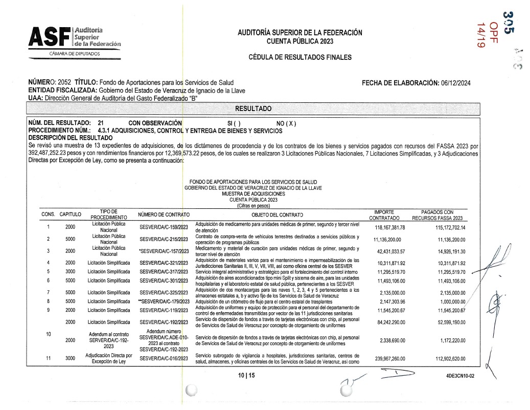 Uno de los hallazgos más graves corresponde al ejercicio 2023, cuando 325 millones 407 mil 850 pesos destinados a la compra de medicamentos e insumos médicos no fueron entregados a SESVER, a pesar de haber sido recibidos por el Gobierno del Estado.