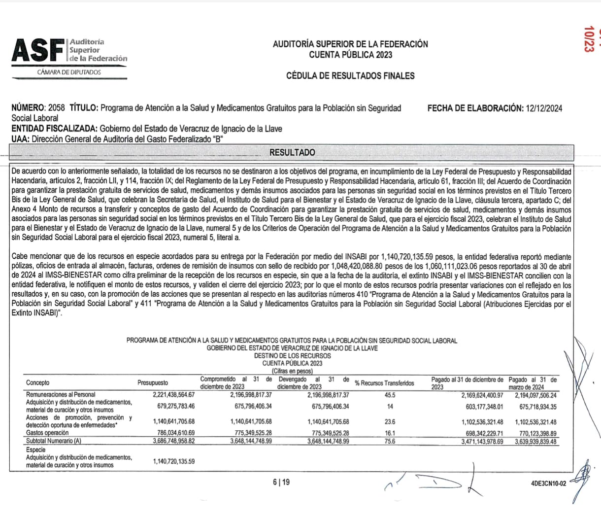 En el Programa de Atención a la Salud y Medicamentos Gratuitos para la Población sin Seguridad Social, conforme a la Cédula de Resultados Finales de la Cuenta Pública 2023, de fecha 12 de diciembre de 2024, la ASF determinó que SEFIPLAN y SESVER no informaron que el destino final de los recursos era la prestación gratuita de servicios de salud y medicamentos, como lo establecen los convenios federales.