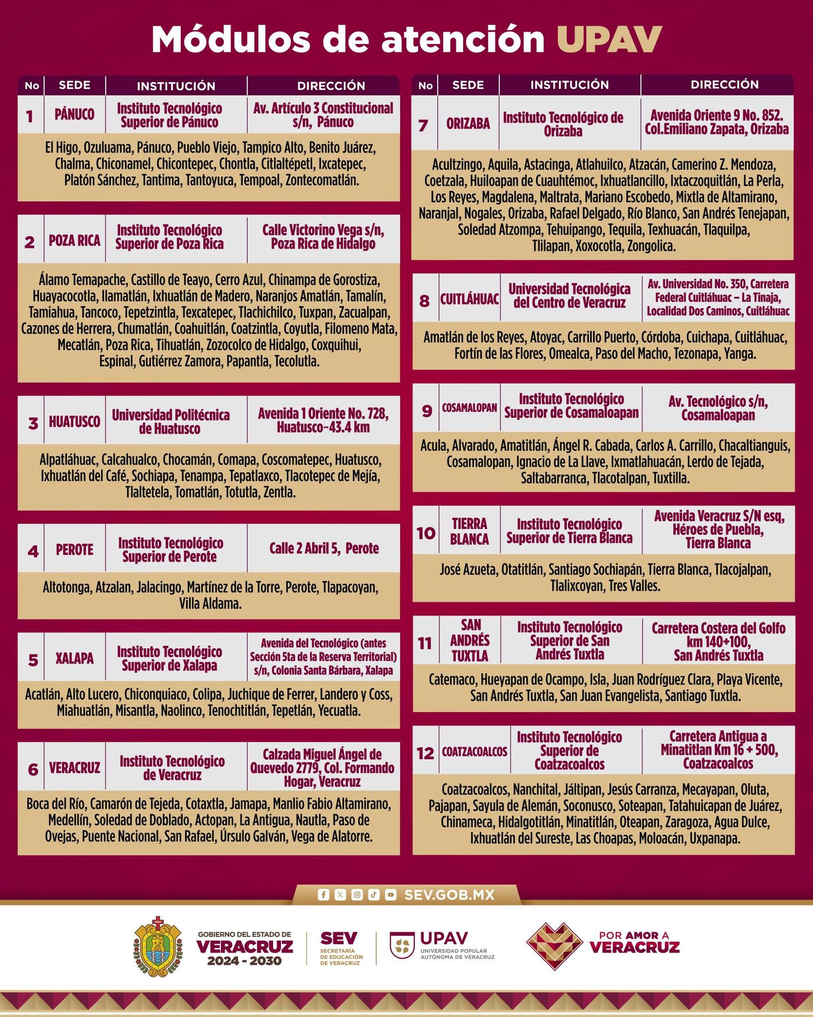 La Universidad Popular Autónoma de Veracruz (UPAV) informa la apertura de 12 sedes regionales para la integración y validación de expedientes de maestras, maestros, directoras y directores de la UPAV, quienes deberán acudir al módulo que les corresponda de acuerdo con su región.