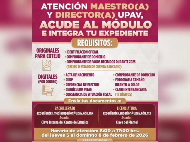 Estos módulos atenderán exclusivamente a personal docente y directivo de Educación Media Superior y Educación Superior de la UPAV, para la correcta integración de su expediente institucional, mediante la presentación de documentación impresa para cotejo y el envío de archivos en formato digital.