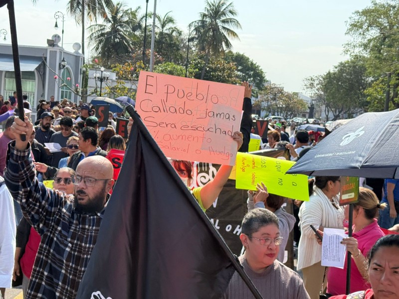 Al grito de “no nos moverán”, los manifestantes marcharon por calles del Centro Histórico de la ciudad y se plantaron a las afueras del Ayuntamiento porteño, para instar a las autoridades de la UV a responder sus exigencias.