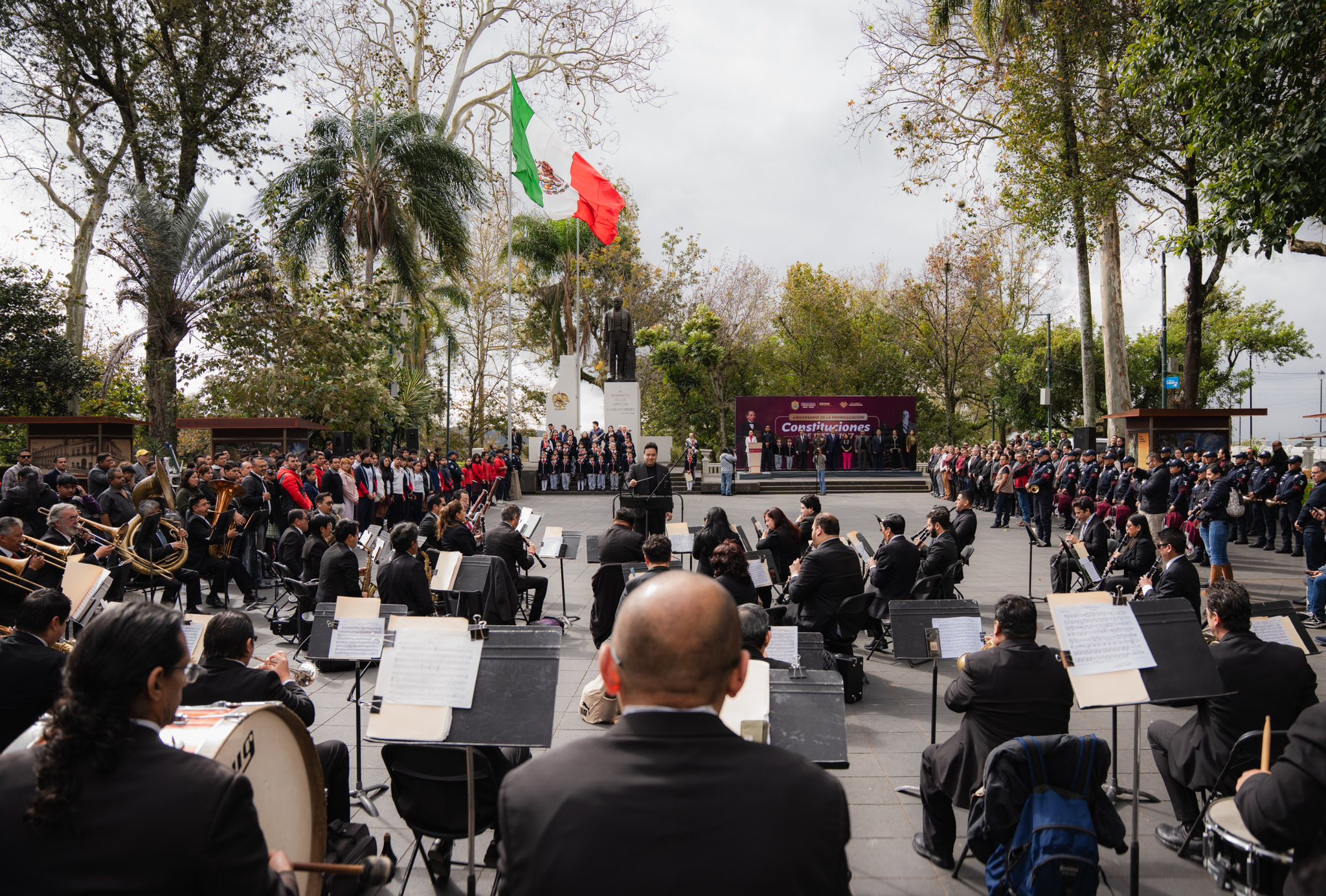 En una ceremonia marcada por el civismo y la unidad institucional, el Secretario de Gobierno, Ricardo Ahued Bardahuil, encabezó este jueves en el Parque Juárez el acto conmemorativo del aniversario de la promulgación de las Constituciones de 1857 y 1917.