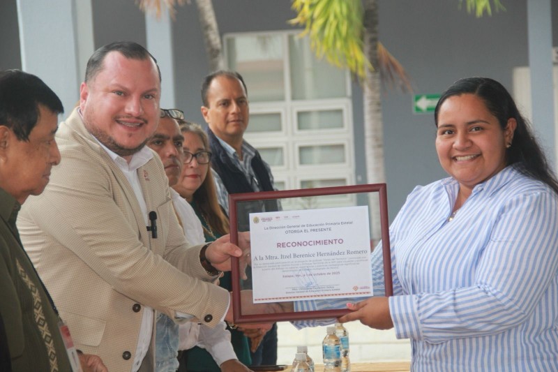 La Secretaría de Educación de Veracruz (SEV), a través de la Dirección General de Educación Primaria Estatal, otorgó un reconocimiento a la maestra Itzel Berenice Hernández Romero, adscrita a la Escuela Primaria Guillermo Prieto, ubicada en la localidad de Los Teteles, por su destacada participación en el podcast Voces del Territorio.