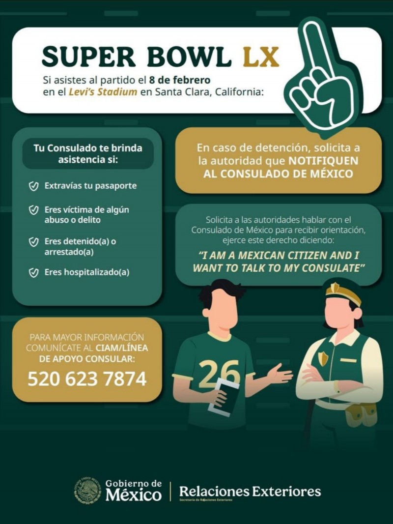 A un día de celebrarse el Super Bowl LX en el Levi’s Stadium de Santa Clara, California, la Secretaría de Relaciones Exteriores (SRE) y el Consulado en San Francisco hicieron un atento llamado a los connacionales que viajan para dicho evento de la NFL, instándolos a mantener un comportamiento responsable ante la posibilidad de operativos migratorios por parte del Servicio de Inmigración y Control de Aduanas de EE.UU.(ICE en inglés).