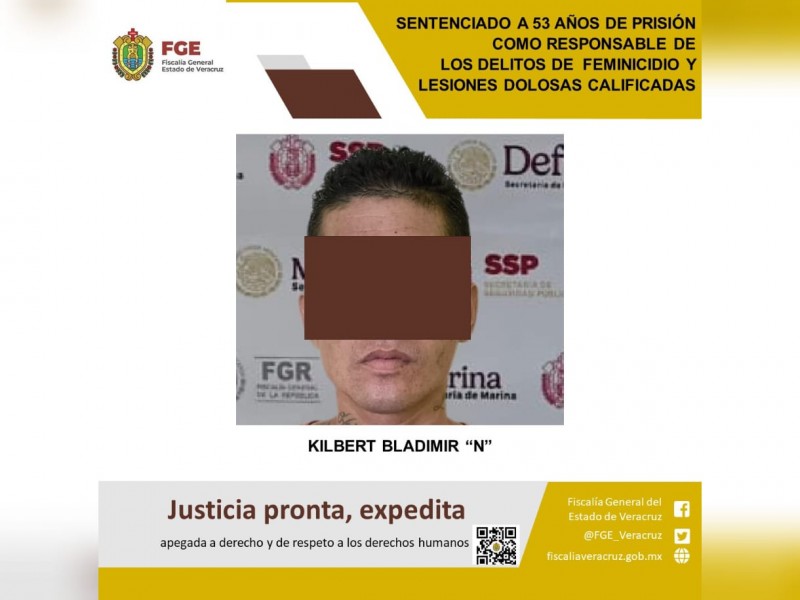 La Fiscalía General del Estado, a través de la Fiscalía Regional Coatzacoalcos, obtuvo de un juez una sentencia condenatoria de 53 años de prisión en contra de Kilbert Bladimir “N”, como responsable de los delitos de feminicidio y lesiones dolosas calificadas, cometidos en agravio de dos víctimas cuyas identidades se encuentran legalmente resguardadas.