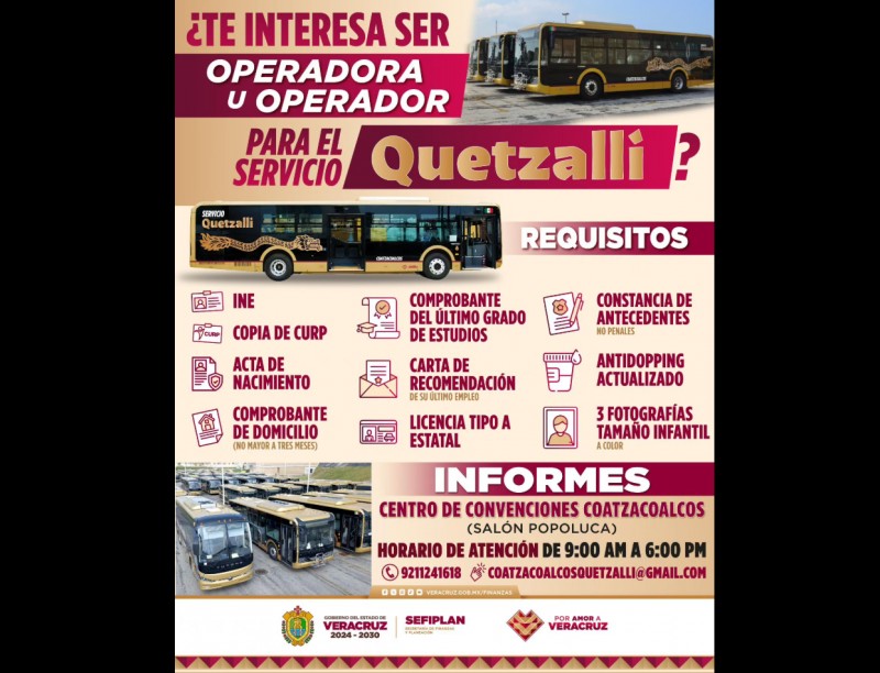 Las autoridades informaron que la recepción de solicitudes se realiza en un horario de 9:00 a 18:00 horas. La administración estatal enfatizó que el sistema Quetzalli representa una apuesta por un transporte digno y eficiente, por lo que el proceso de selección será riguroso para garantizar la seguridad de los usuarios. Para resolver dudas sobre requisitos técnicos, se ha habilitado la línea telefónica 921 124 1618.