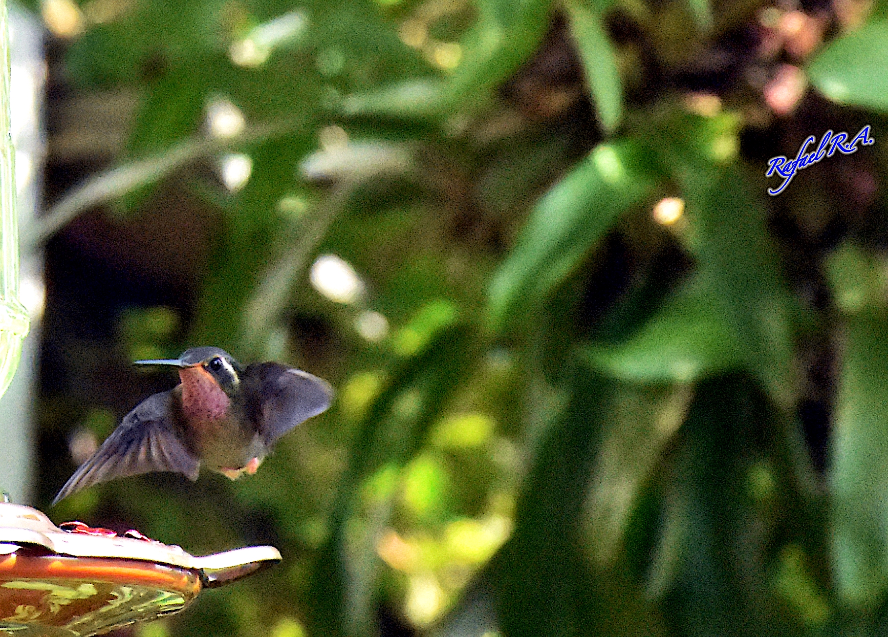 Colibrí amatistino. A pesar de su nombre tan emocionante, suele verse apagado y grisáceo con una máscara obscura, línea ocular blanquecina y garganta obscura, su gorguera color amatista rara vez refleja la luz.