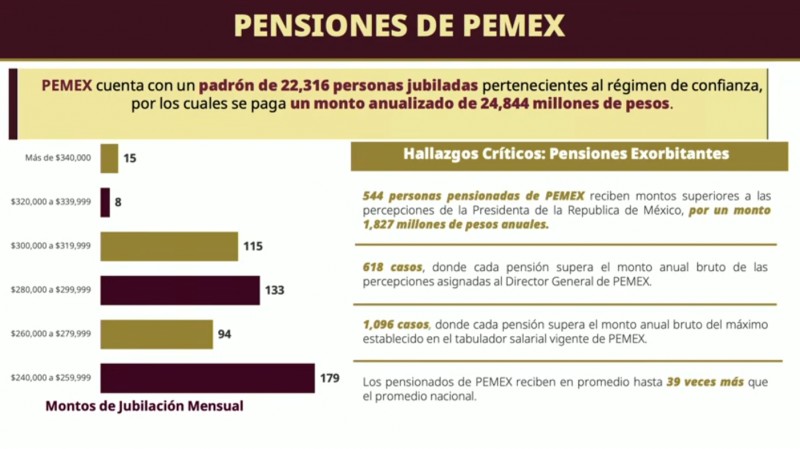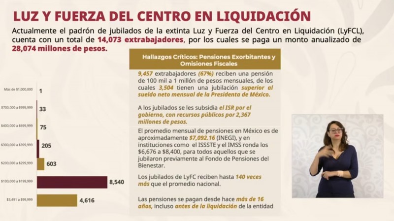La funcionaria destacó el caso de los jubilados de Luz y Fuerza del Centro, quienes reciben un subsidio parcial en el Impuesto Sobre la Renta (ISR), lo que le cuesta al erario aproximadamente 2 mil 400 millones de pesos al año. Esta cifra, señaló, representa una carga injustificada y desproporcionada en comparación con el resto de los trabajadores que se encuentran en proceso de jubilación en el país.