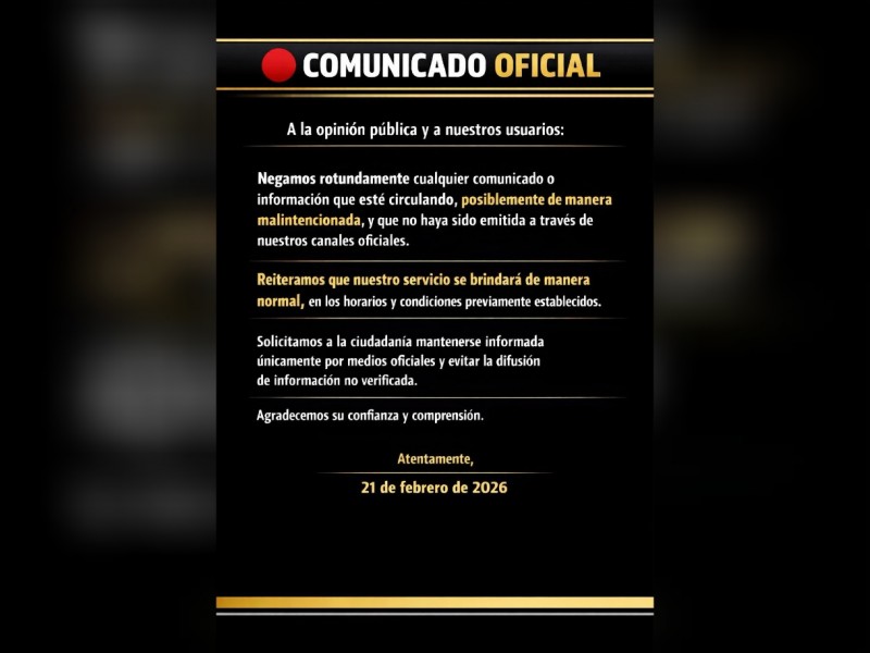 "Negamos rotundamente cualquier comunicado o información que esté circulando, posiblemente de manera malintencionada y que no haya sido emitida a través de nuestros canales oficiales”, señaló.