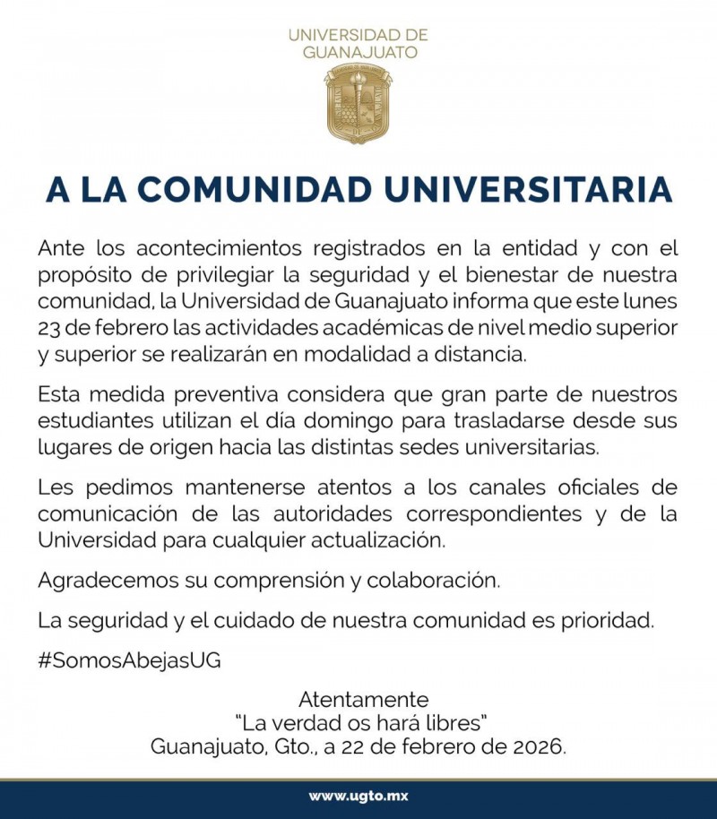 La Universidad de Guanajuato informó que, ante los acontecimientos registrados en la entidad y con el objetivo de priorizar la seguridad de su comunidad, las actividades académicas de nivel medio superior y superior se realizarán en modalidad a distancia este lunes 23 de febrero. La institución explicó que la medida busca prevenir riesgos, considerando que muchos estudiantes se trasladan desde distintos municipios hacia las sedes universitarias.