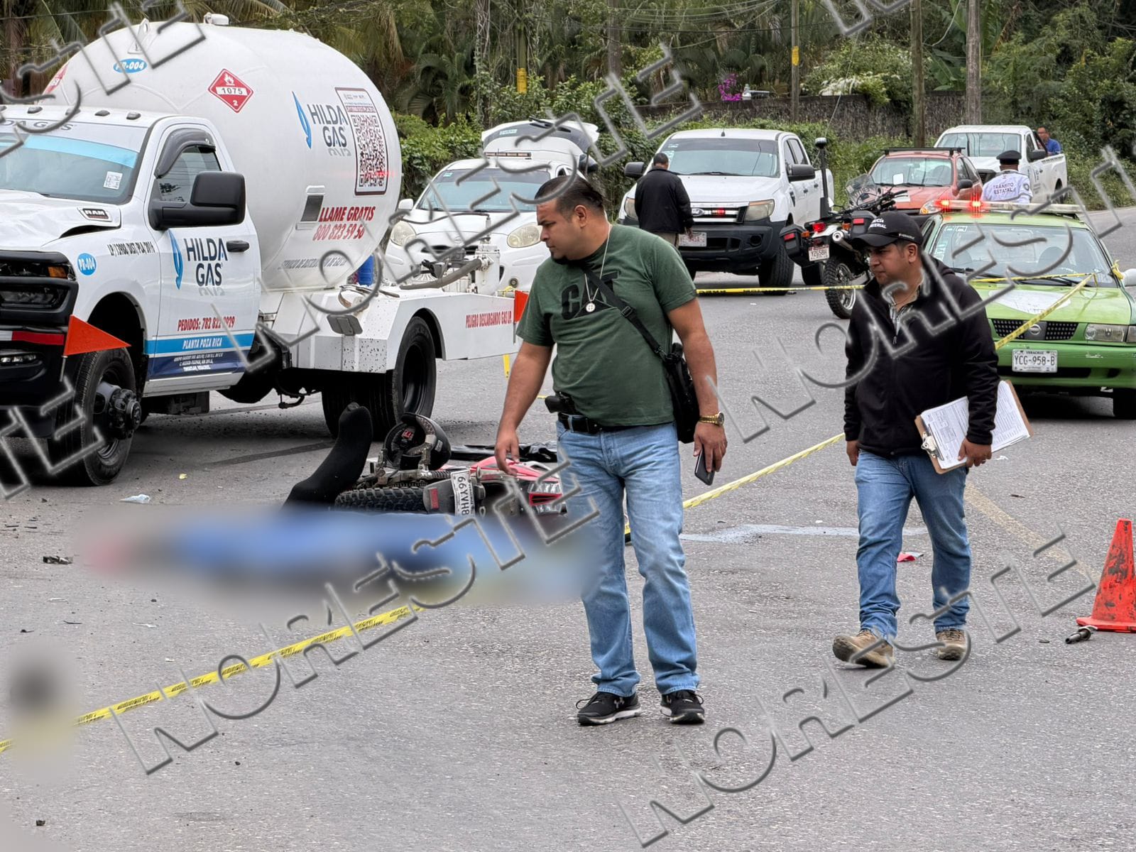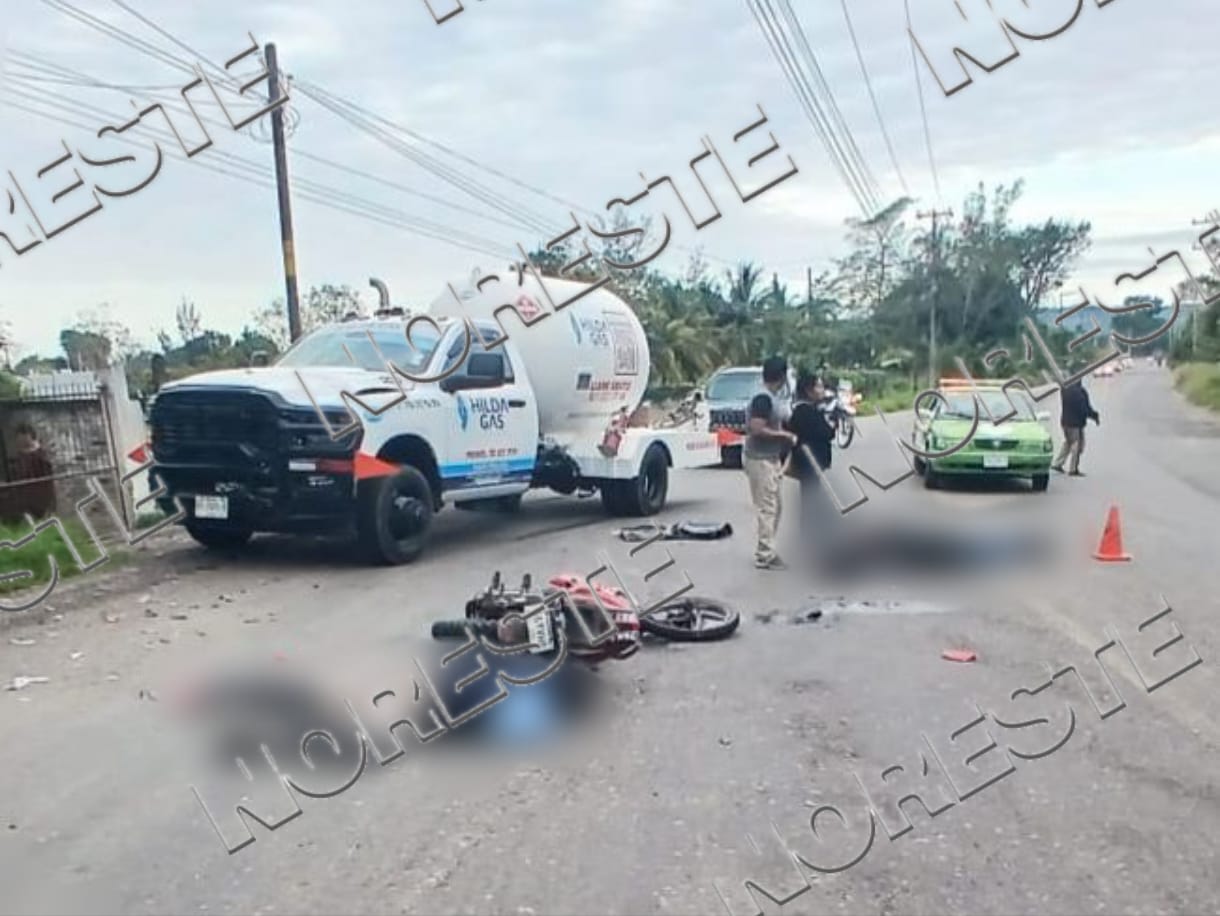 El accidente ocurrió cuando el motociclista, que viajaba en una Italika FT 250 color rojo con su pareja, perdió el control de la unidad en una peligrosa curva y se estrelló de frente con una camioneta RAM 350 que transportaba gas de la empresa Hilda Gas.
