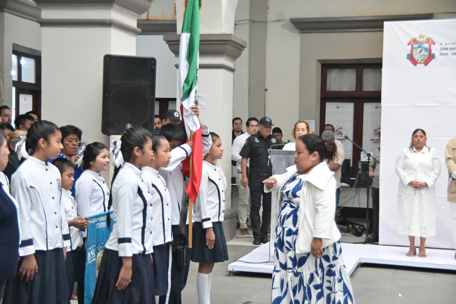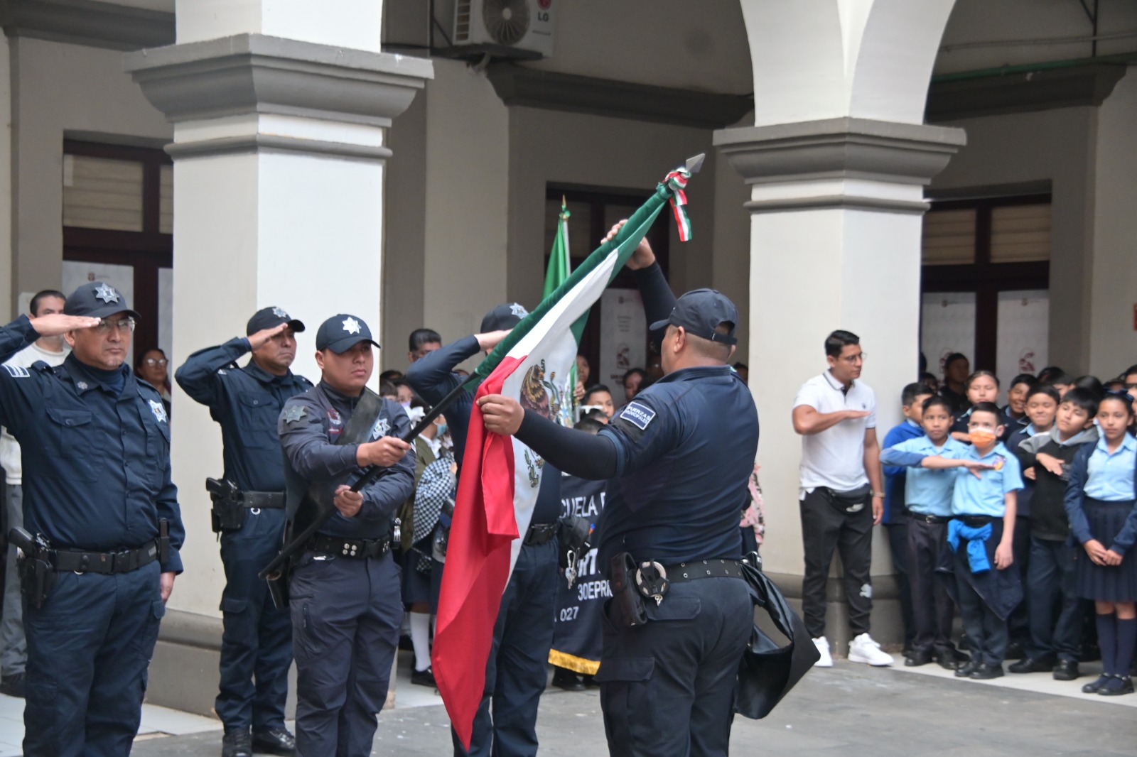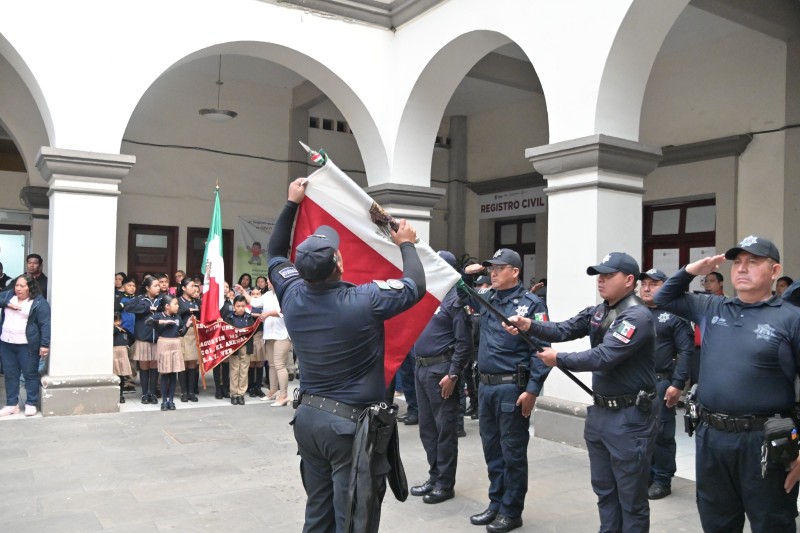 Acompañados de trabajadores municipales, así como alumnos y maestros de instituciones educativas de la ciudad, rindieron homenaje al máximo lábaro patrio del país, que representa la historia e identidad de las y los mexicanos.