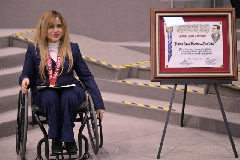 En reconocimiento a su destacada trayectoria en favor de la inclusión, la accesibilidad y el deporte adaptado, la gobernadora Rocío Nahle García entregó, en representación de los tres Poderes del Estado, la Medalla Adolfo Ruiz Cortines 2025 a la ciudadana María Luisa Bandala Pantoja.