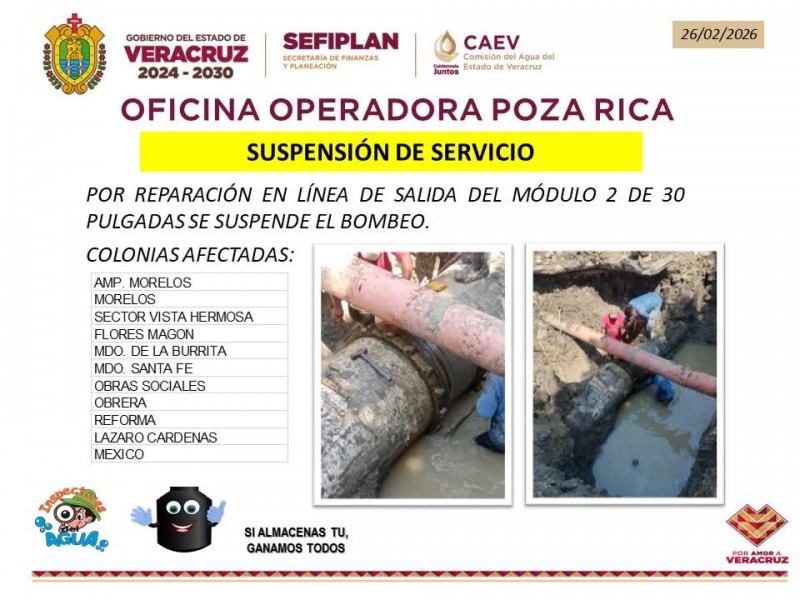 La Oficina Operadora de la Comisión del Agua del Estado de Veracruz (CAEV) conceden Poza Rica, informó la interrupción del bombeo de agua potable en amplios sectores de la ciudad, debido a trabajos de reparación en una de las líneas principales de salida del sistema hidráulico.