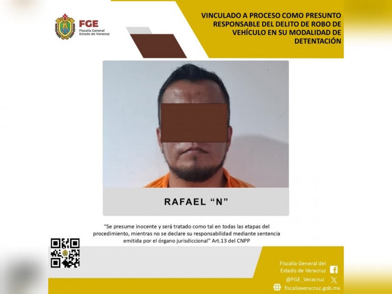 La Fiscalía General del Estado, a través de la Fiscalía de Investigaciones Ministeriales, presentó ante el órgano jurisdiccional datos de prueba que permitieron la vinculación a proceso en contra de Rafael “N”, como presunto responsable del delito de robo de vehículo, en su modalidad de detentación.