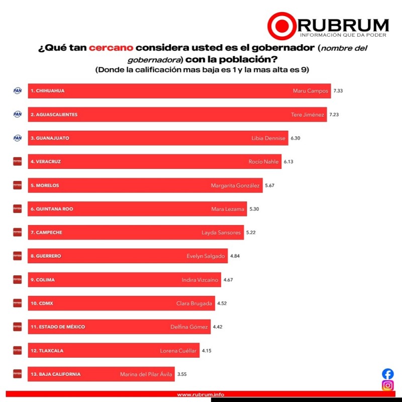La cercanía con la población es otro pilar en el que Nahle García sobresale. Con una calificación de 6.13, la gobernadora ratificó su lugar en el "Top 4" de calidez y presencia territorial. Este resultado respalda el compromiso manifestado por la mandataria de mantener un gobierno itinerante y directo en los municipios, alejándose de la burocracia de oficina.
