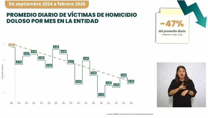 El Secretariado Ejecutivo del Sistema Nacional de Seguridad Pública (SESNSP) reveló este viernes un avance sin precedentes en la agenda de seguridad de Jalisco. De acuerdo con el último informe de incidencia delictiva, el estado registró una reducción del 47% en homicidios dolosos en el periodo comprendido entre septiembre de 2024 y enero de 2026.