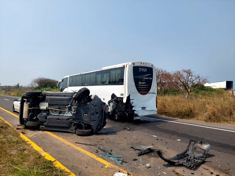Una camioneta terminó volcada sobre el bulevar Riviera Veracruzana, en la zona de Antón Lizardo, luego de impactarse contra un autobús de turismo durante el mediodía de este sábado 7 de marzo.