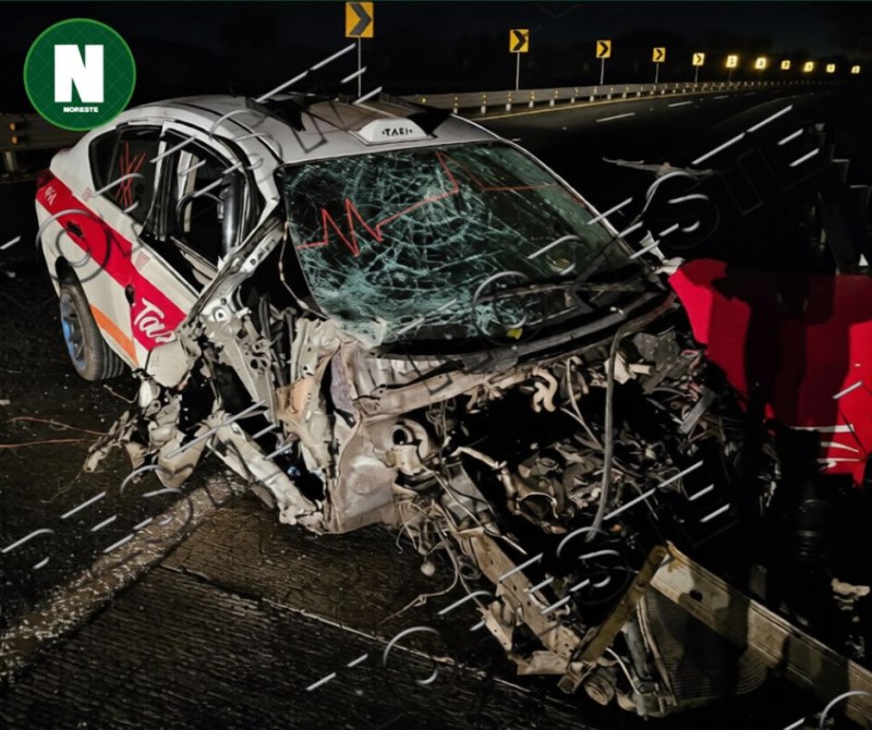 Un taxi quedó completamente destrozado luego de que su conductor se impactara contra la barrera metálica de contención y una señalética sobre la autopista México–Tuxpan.