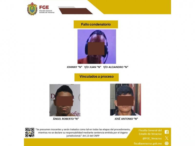 Como resultado del trabajo de investigación y judicialización de casos, la Fiscalía General del Estado de Veracruz obtuvo un fallo condenatorio y diversas vinculaciones a proceso contra presuntos responsables de distintos delitos en las regiones centro y sur de la entidad, fortaleciendo las acciones para llevar ante la justicia a quienes presuntamente han cometido conductas delictivas.