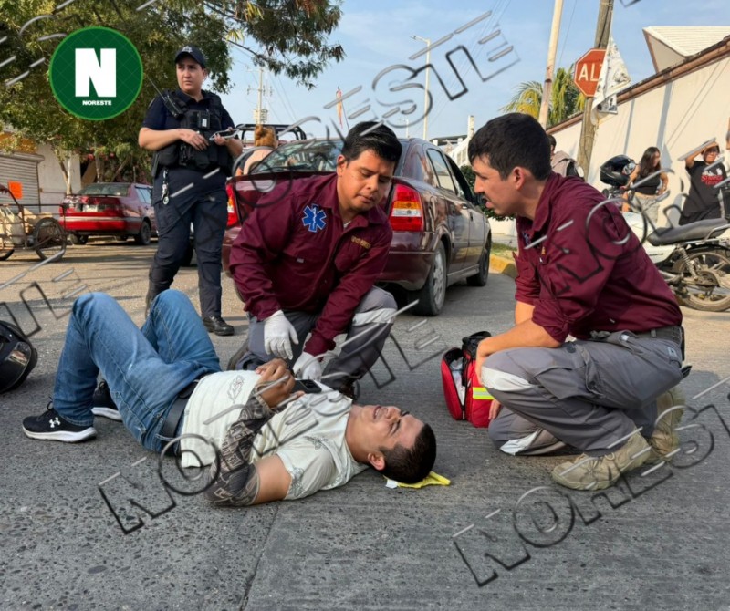 Un motociclista resultó lesionado luego de ser impactado por un vehículo Chevrolet color vino que no respetó el señalamiento de alto en la colonia Cazones.