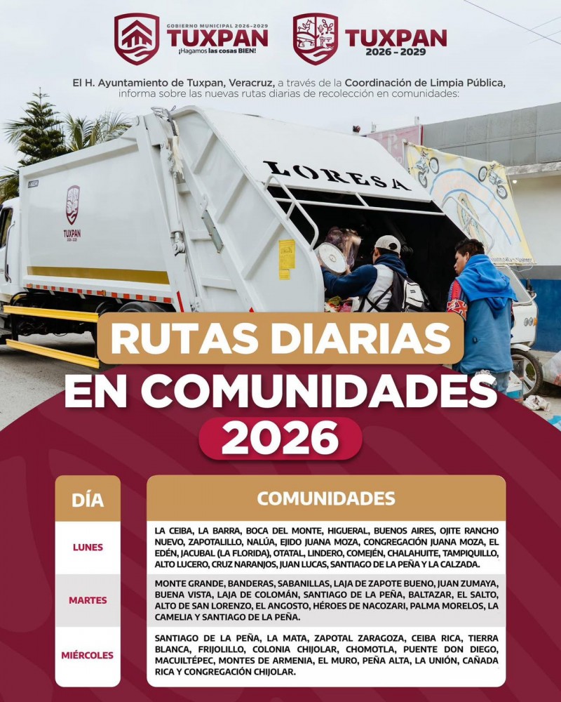 Durante el anuncio también se dieron a conocer las rutas diarias que seguirán los camiones recolectores, con el objetivo de que las familias conozcan con anticipación el día en que el servicio llegará a sus localidades y puedan organizar la disposición adecuada de sus residuos.